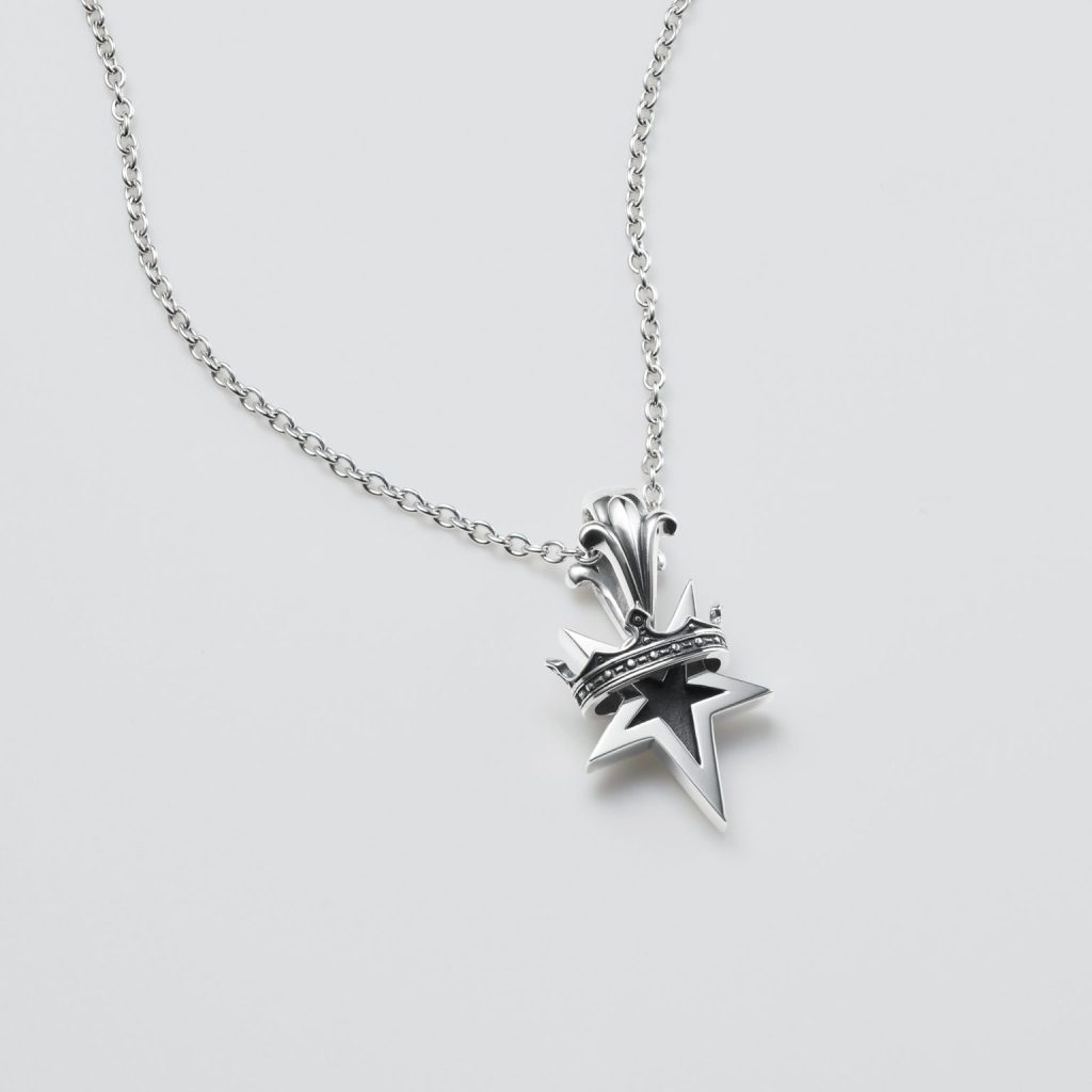 “SWEET MOON”, adorned with a crowned moon motif, is designed with a sense of quiet presence. The reverse side features a clear stone inspired by light entering the interior of a fractured stone monument, offering a contrasting expression from the front. Soft curves and restrained detailing make this piece easy to style regardless of outfit.