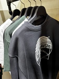 ジャケット、スウェットは、ヒップホップの自由さとハードコアの、その両方を内包している。現代的なシルエットと融合し、日常へとシームレスにつながっていく。音楽と服の関係性も、この展示の重要な軸だ。